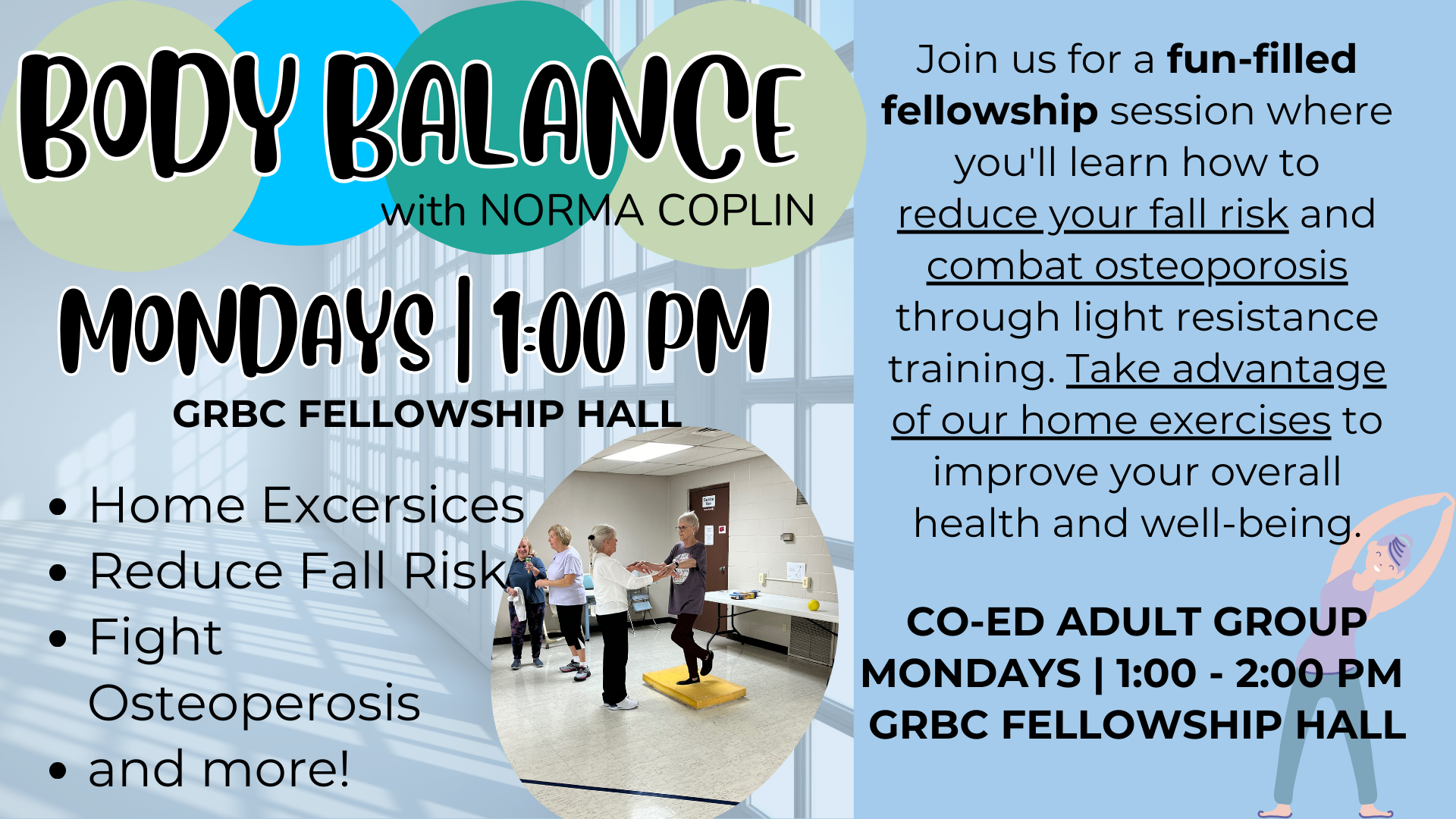 PLEASE JOIN US ON MONDAY’S AT 1:00 PM FOR BODY BALANCE. THIS IS A FREE CLASS.